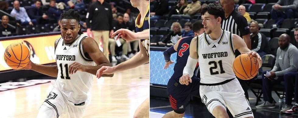 One of the top scoring tandems in college basketball is doing its work in Spartanburg, South Carolina. Wofford's Kahmare Holmes (above left) and Nils Machowski (above right) entered the week combining to score 44.7 points per game in Southern Conference play, a number that ranks among the best in the country. The only duo averaging more in conference games is BYU's AJ Dybantsa and Robert Wright II, who are teaming up for 47.6 points per night in Big 12 contests.